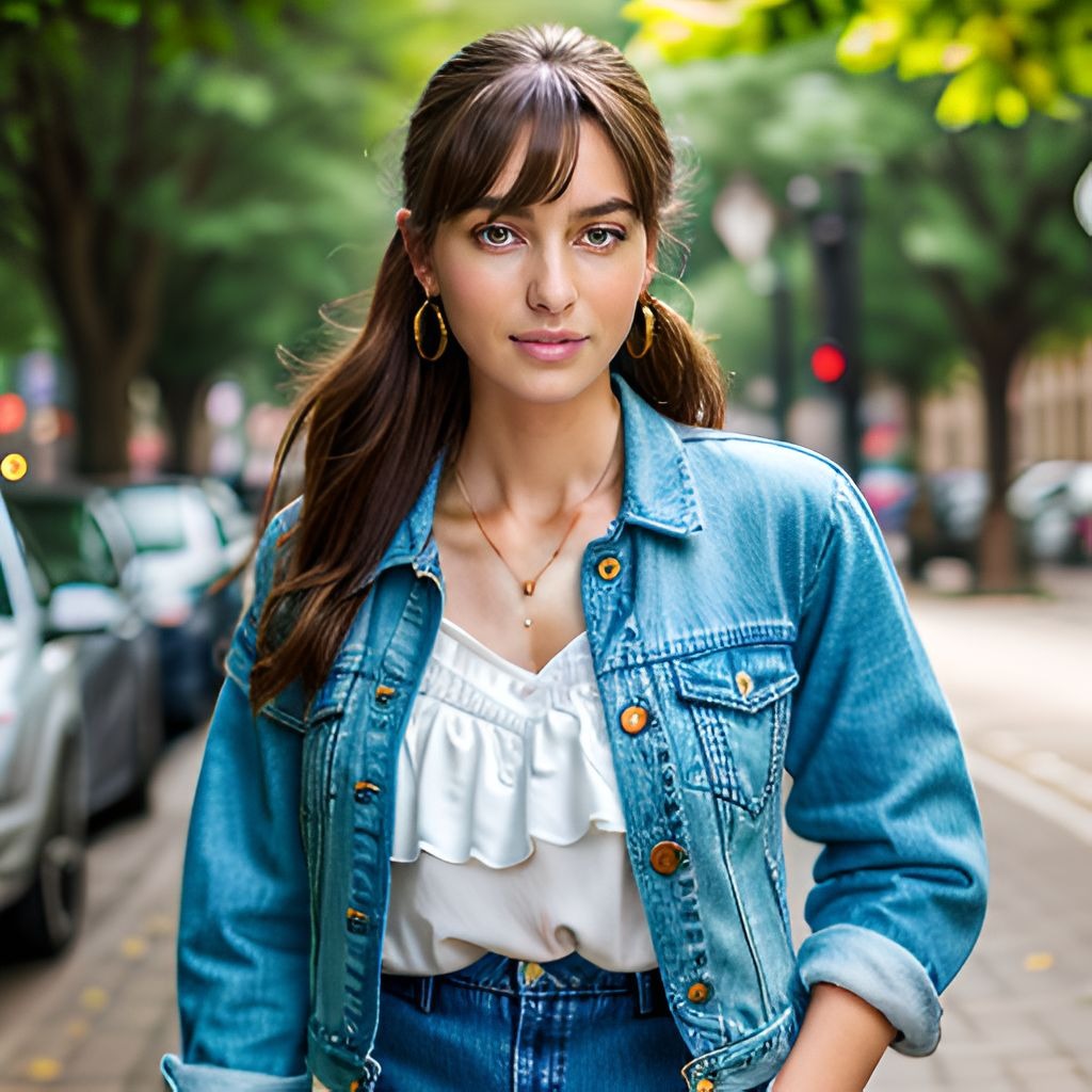 3. デニムジャケットとフリルスカート:カジュアルなデニムジャケットに、女性らしいフリルスカートを合わせてみてください。ピアスのフェミニンな雰囲気と、ジャケットのクールなイメージが絶妙にマッチします。